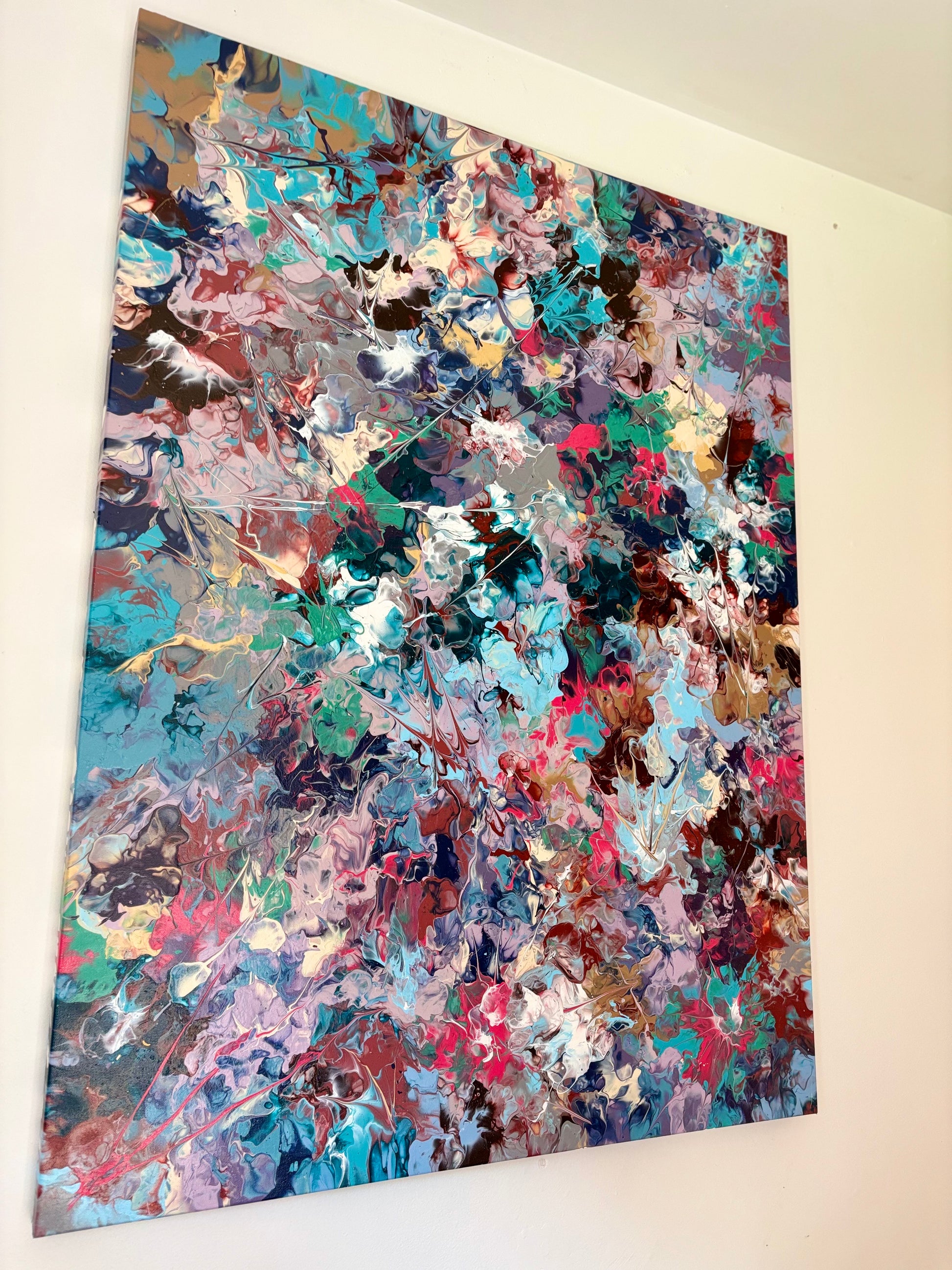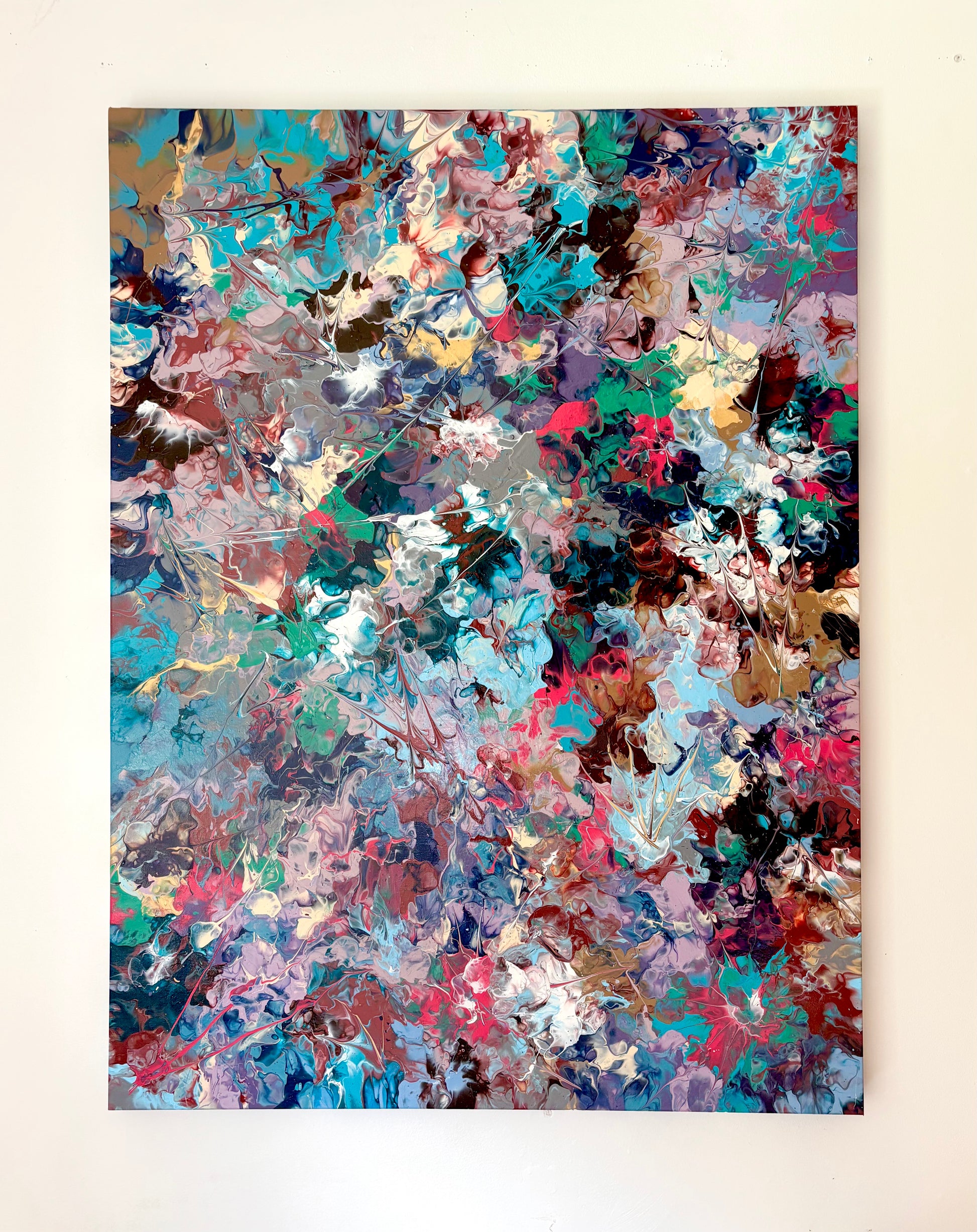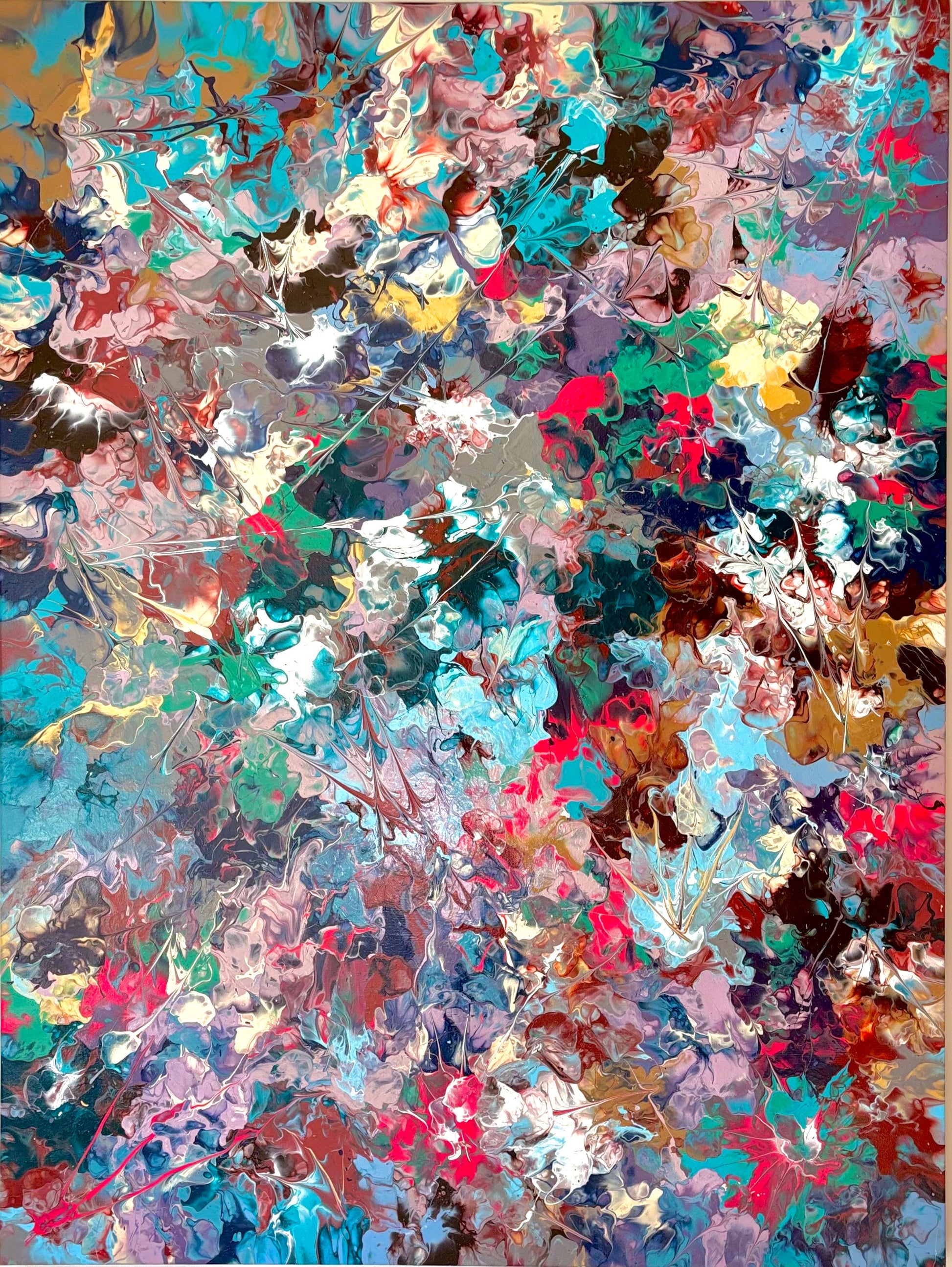 Bellissimi Occhi Verdi (Beautiful Green Eyes) is a 36x48x1 canvas radiating vibrancy and intimacy. Painted in an Art Deco–inspired palette, layers of teal, emerald, gold, crimson, lavender, and ivory swirl together in a textured symphony of movement and light. The composition evokes the luminous depth and mystery of green eyes, simultaneously tender and magnetic. Big Blind channels admiration for his muse into bold abstraction, where elegance meets emotion. The piece becomes both a tribute and a reflection of beauty’s power to captivate, immortalizing fleeting inspiration in radiant, fluid color.