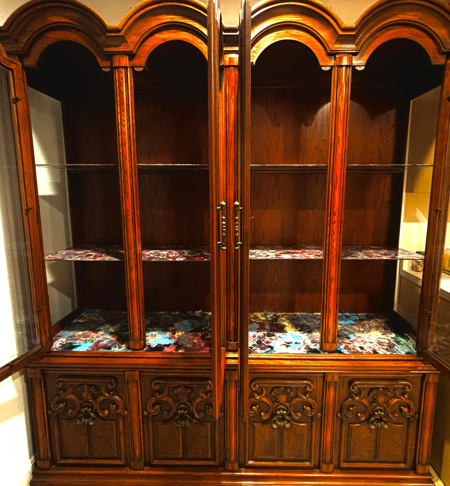 Solid honey oak armoire with glass shelving painted in a Baroque palette using acrylic paints.