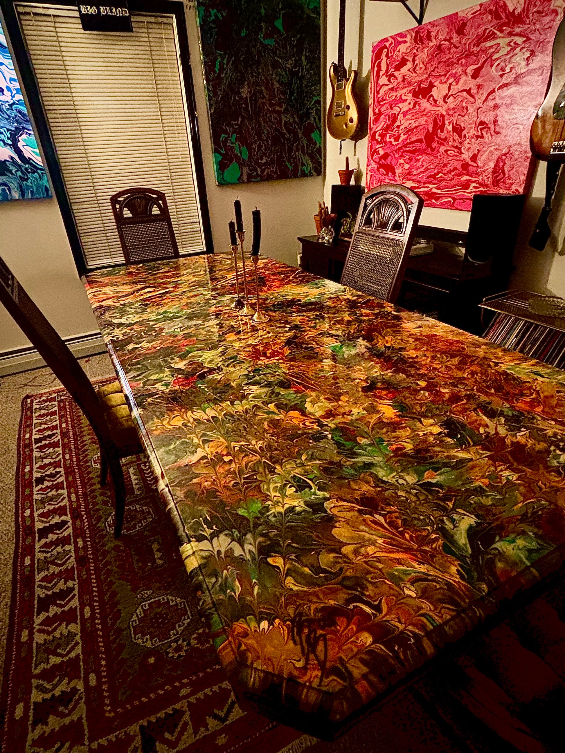 Big Blind's palette interpretation of Caravaggio's "Jules slaying Holofernes" and Poussin's " Venus and Adonis." characterized by bold colors and stark contrast as well as its dramatic, ornate, and emotionally intense style.